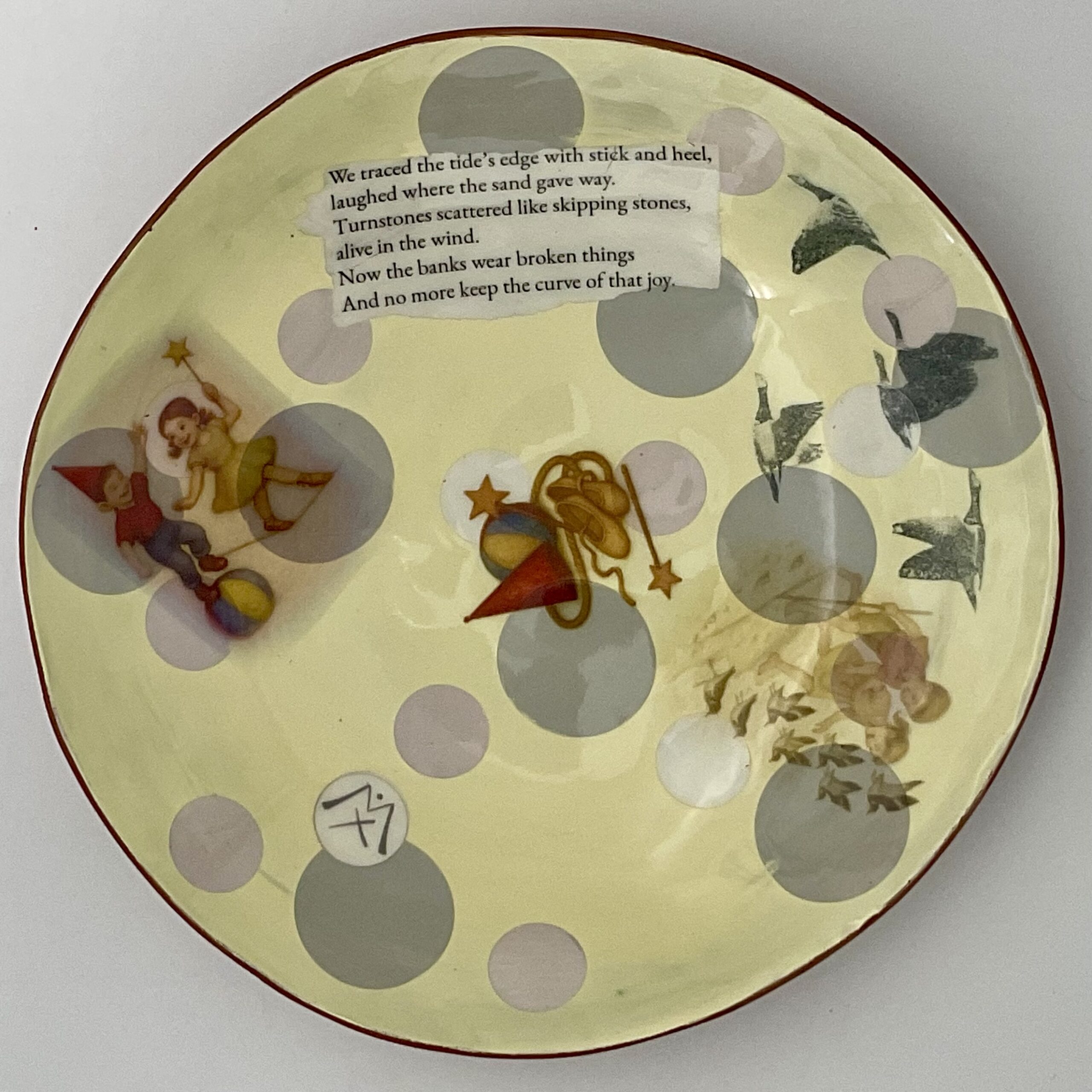 The poem inscribed within the bowl evokes the quiet beauty of winter estuaries, where migrating birds stitch across grey horizons and memories linger like shadows. Polka dot patterns and layered imagery create a whimsical yet reflective aesthetic, making this bowl as much a piece of storytelling as it is a vessel.