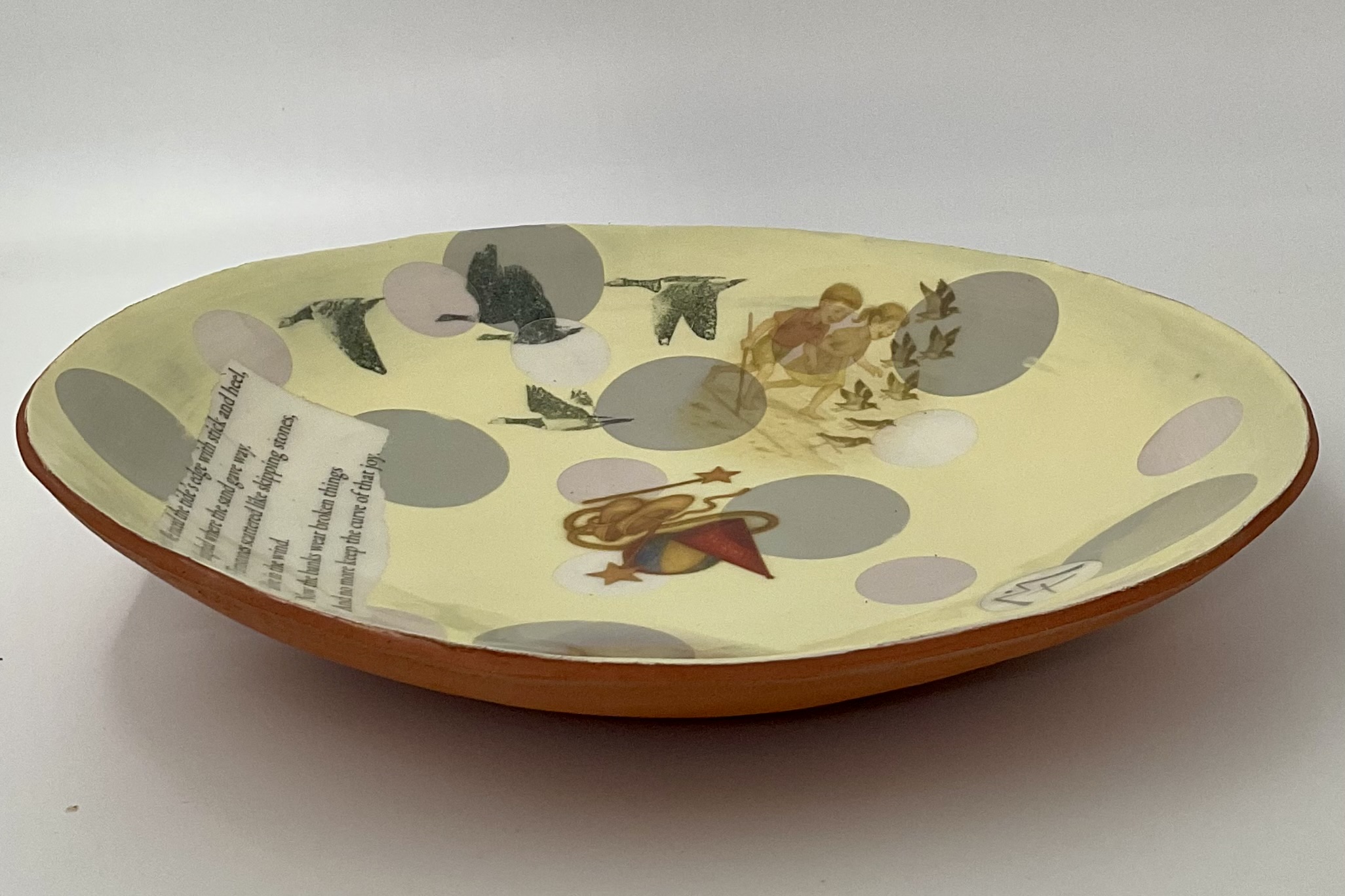 This unique handcrafted slipware and printed terracotta bowl is a one-of-a-kind piece of contemporary ceramic art. Its design draws on nostalgic childhood memories of estuary life and imaginative play, blending vintage imagery with natural motifs. The surface is decorated with printed illustrations, playful figures, and a poignant poem that captures the feeling of solastalgia—a longing for a lost place and time.